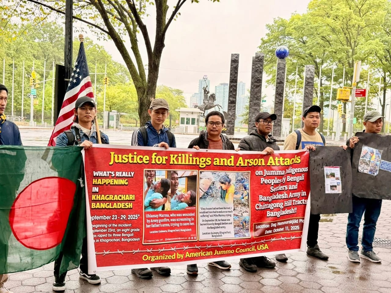 Hill Voice, 13 October 2025, International Desk: A protest was held in front of the United Nations headquarters (Dag Hammarskjöld Plaza) to condemn the alleged rape of an eighth-grade girl in Guimara of Khagrachari, as well as the reported brutal attack and arson by Bengali settlers and the Bangladesh military in Ramesu Bazar of Guimara Upazila. The event was organized by the American Jummo Council (AJC) on Saturday (11 October).
