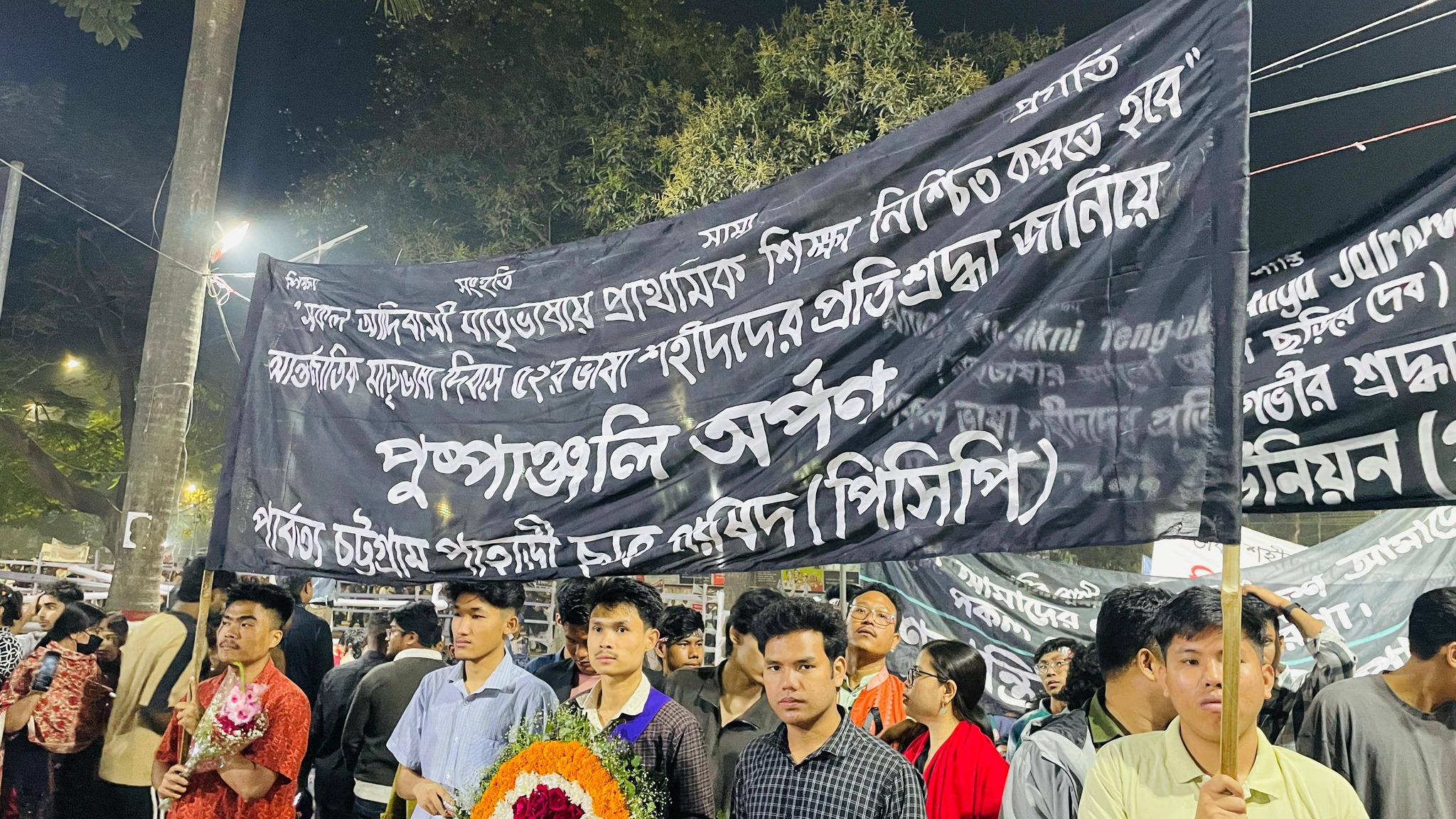 রাজশাহী: মহান শহীদ দিবস ও আন্তর্জাতিক মাতৃভাষা দিবস ২০২৬ উপলক্ষে রাজশাহী বিশ্ববিদ্যালয়ের কেন্দ্রীয় শহীদ মিনারে একুশের প্রথম প্রহরে শ্রদ্ধাঞ্জলি প্রদান করেছে পার্বত্য চট্টগ্রাম পাহাড়ী ছাত্র পরিষদ, রাজশাহী মহানগর শাখা। পুষ্পস্তবক অর্পণ শেষে ভাষা শহীদদের স্মরণে দাঁড়িয়ে এক মিনিট নিরবতা পালন করা হয়। এসময় পিসিপির রাজশাহী মহানগর শাখার সভাপতি সুমন চাকমা, সাধারণ সম্পাদক ময়ন্ত তঞ্চঙ্গ্যা, সাংগঠনিক সম্পাদক প্রাচুর্য চাকমা প্রমুখ।