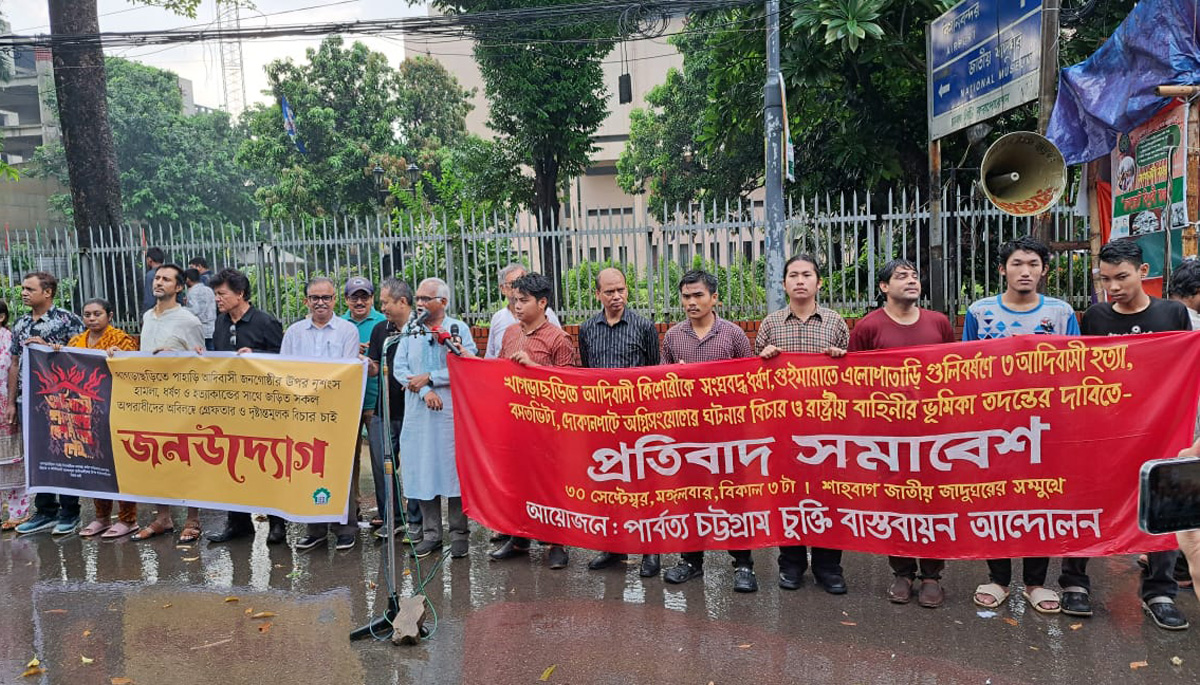 হিল ভয়েস, ৩০ সেপ্টেম্বর ২০২৫, ঢাকা: আজ ৩০ সেপ্টেম্বর ২০২৫, রোজ মঙ্গলবার, বিকাল ৪টায় শাহবাগ, জাতীয় জাদুঘরের সম্মুখে খাগড়াছড়িতে ধর্ষকদের গ্রেফতার ও দৃষ্টান্তমূলক শাস্তি এবং পাহাড়ী আদিবাসীদের অধিকার হরণ, বিচারহীনতা বন্ধ ও পার্বত্য চট্টগ্রামে শান্তি প্রতিষ্ঠায় প্রধান উপদেষ্টার উদ্যোগ গ্রহণের দাবিতে পার্বত্য চট্টগ্রাম চুক্তি বাস্তবায়ন আন্দোলন এর আয়োজনে একটি প্রতিবাদ সমাবেশ অনুষ্ঠিত হয়।