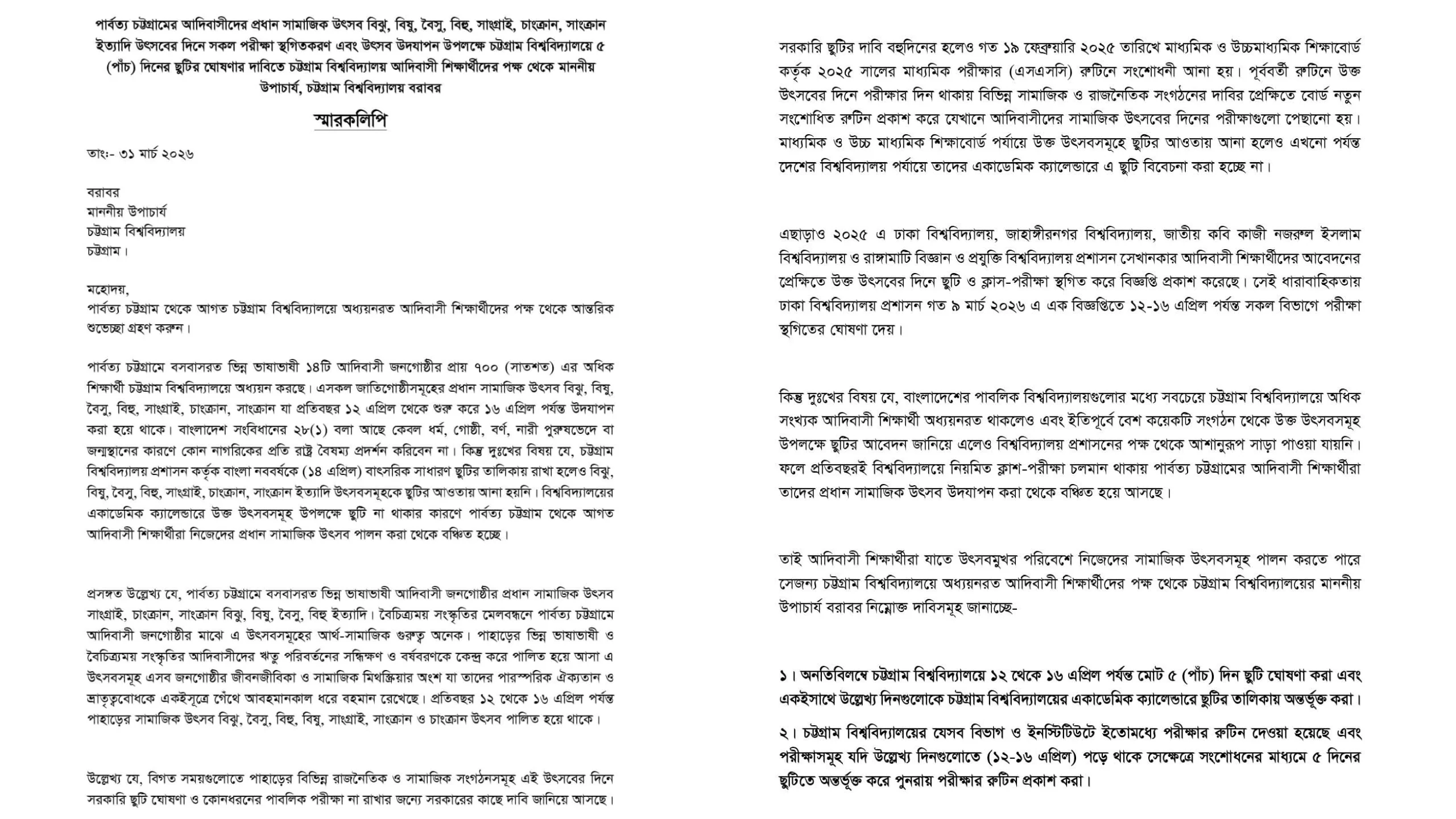 স্মারকলিপিতে বলা হয়, চট্টগ্রাম বিশ্ববিদ্যালয়ে পার্বত্য চট্টগ্রাম থেকে আগত ১৪টি আদিবাসী জনগোষ্ঠীর প্রায় ৭ শতাধিক শিক্ষার্থী পড়াশোনা করছেন। প্রতিবছর ১২ থেকে ১৬ এপ্রিল পর্যন্ত পাহাড়ের প্রধান সামাজিক উৎসবগুলো উদযাপিত হয়। সংবিধানের ২৮(১) অনুচ্ছেদ অনুযায়ী ধর্ম-বর্ণ-গোষ্ঠী নির্বিশেষে বৈষম্যহীনতার কথা বলা হলেও, বিশ্ববিদ্যালয় প্রশাসন বাংলা নববর্ষের ছুটি রাখলেও আদিবাসীদের এই বৃহৎ উৎসবগুলোতে কোনো ছুটির ব্যবস্থা রাখেনি। ফলে প্রতিবছর শিক্ষার্থীরা তাদের নিজস্ব সংস্কৃতি ও উৎসব পালন থেকে বঞ্চিত হচ্ছে।