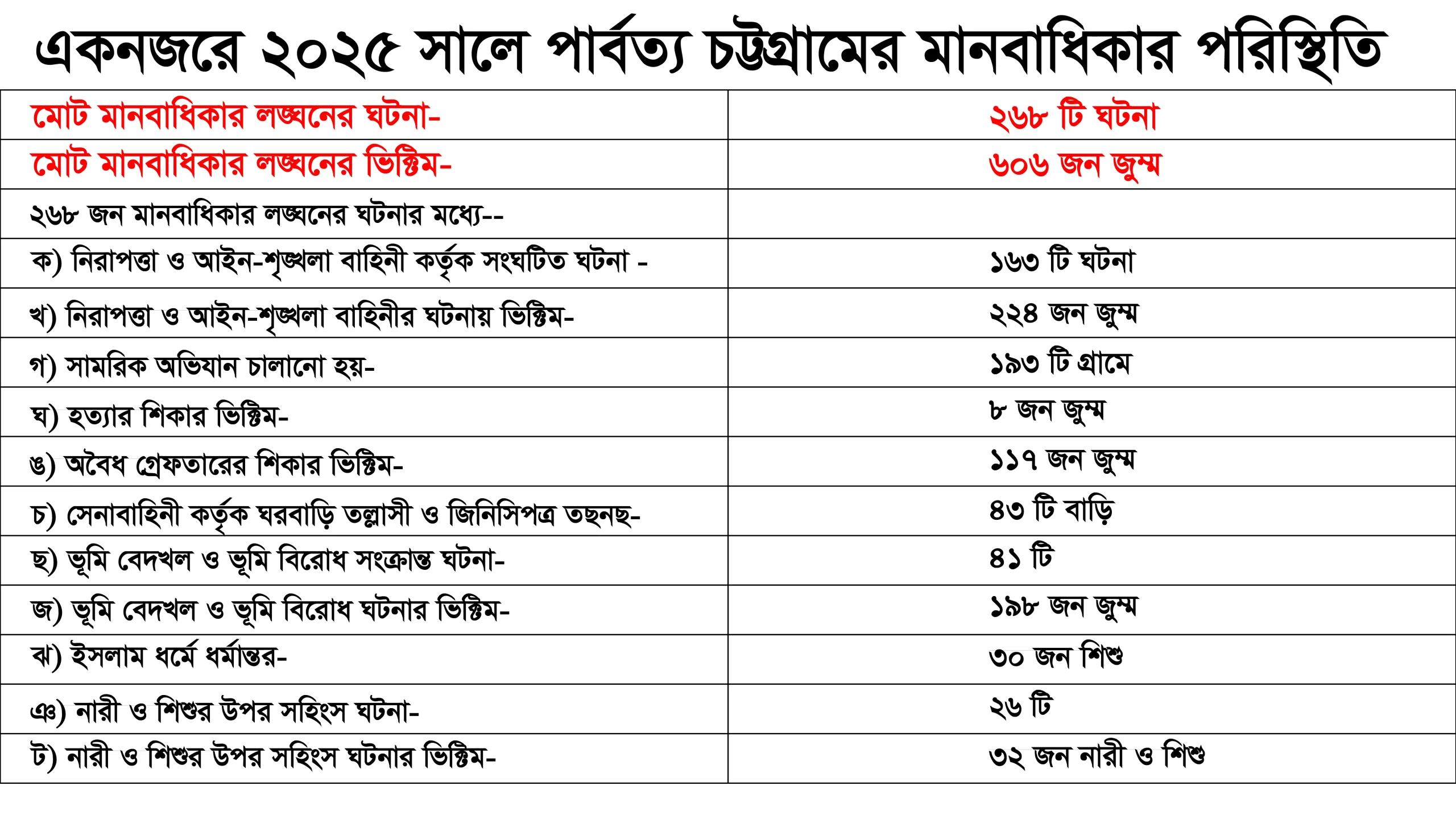পার্বত্য চট্টগ্রাম চুক্তি বাস্তবায়িত না হওয়ায় ২০২৫ সালে পার্বত্য চট্টগ্রামের মানবাধিকার পরিস্থিতির আরো অবনতি ঘটেছে। ২০২৫ সালে পার্বত্য চট্টগ্রামে নিয়োজিত নিরাপত্তা বাহিনী ও আইন-শৃঙ্খলা বাহিনী, সেনা-মদদপুষ্ট সশস্ত্র সন্ত্রাসী গ্রুপ, সাম্প্রদায়িক ও মৌলবাদী গোষ্ঠী, রোহিঙ্গ্যা সশস্ত্র জঙ্গী, মুসলিম বাঙালি সেটেলার ও ভূমিদস্যুদের দ্বারা ২৬৮টি মানবাধিকার লঙ্ঘনের ঘটনা সংঘটিত হয়েছে এবং এসব ঘটনায় ৬০৬ জন জুম্ম মানবাধিকার লঙ্ঘনের শিকার হয়েছে।
