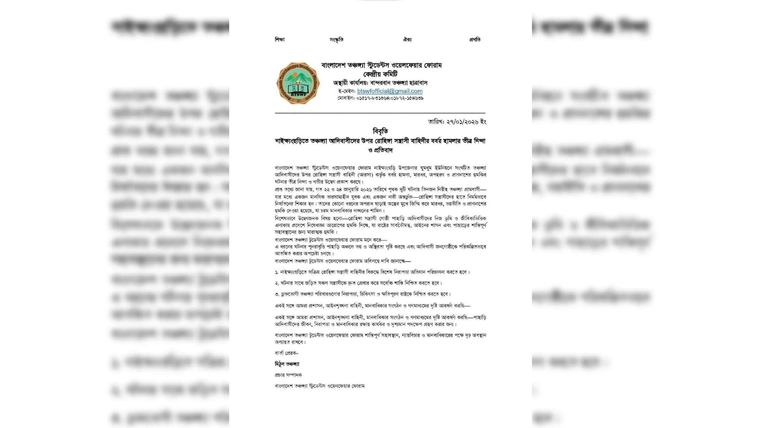 হিল ভয়েস, ২৭ জানুয়ারি ২০২৬, বান্দরবান: বান্দরবান উপজেলাধীন নাইক্ষ্যংছড়ি উপজেলার ঘুমধুম ইউনিয়নে রোহিঙ্গা সন্ত্রাসী বাহিনী (আরসা) কর্তৃক তঞ্চঙ্গ্যা আদিবাসীদের উপর বর্বর হামলা, মারধর, অপহরণ ও প্রাণনাশের হুমকির ঘটনার তীব্র নিন্দা ও গভীর উদ্বেগ প্রকাশ করে এক বিবৃতি প্রদান করেছে বাংলাদেশ তঞ্চঙ্গ্যা স্টুডেন্টস ওয়েলফেয়ার ফোরাম।