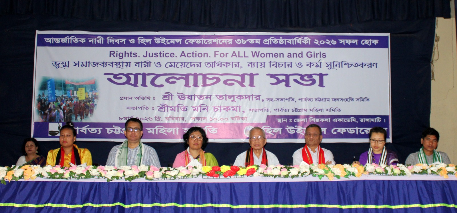 আজ ৮ মার্চ ২০২৬ সকাল ১০টায় পার্বত্য চট্টগ্রাম মহিলা সমিতি ও হিল উইমেন্স ফেডারেশনের যৌথ উদ্যোগে রাঙ্গামাটির জেলা শিল্পকলা একাডেমিতে এই আলোচনা সভা অনুষ্ঠিত হয়।