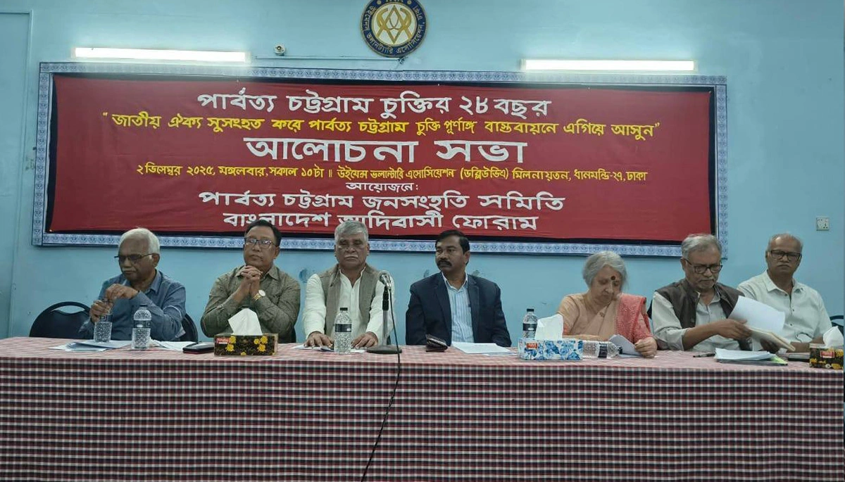 হিল ভয়েস, ২ ডিসেম্বর ২০২৫, ঢাকা: আজ ২ ডিসেম্বর ২০২৫ রোজ, মঙ্গলবার পার্বত্য চট্টগ্রাম চুক্তির ২৮ তম বর্ষপূর্তি উপলক্ষে ঢাকার ধানমন্ডি উইমেন্স ভলান্টারি এসোসিয়েশন মিলনায়তনে পার্বত্য চট্টগ্রাম জনসংহতি সমিতি ও বাংলাদেশ আদিবাসী ফোরামের যৌথ উদ্যোগে এক আলোচনা সভা অনুষ্ঠিত হয়েছে।