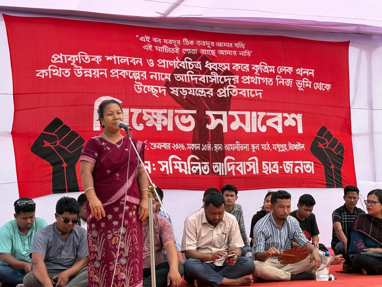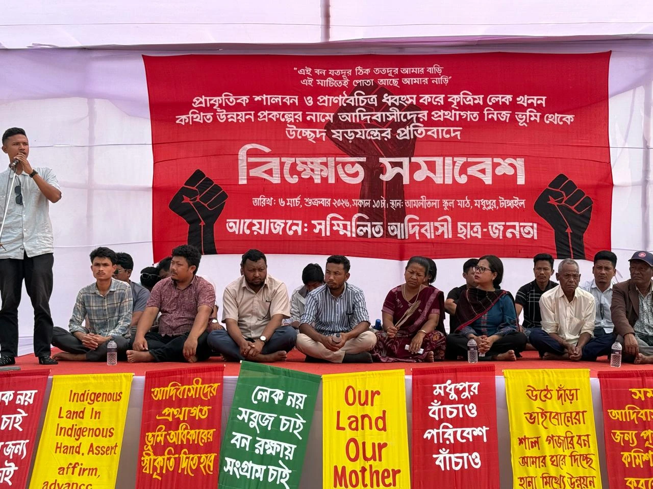 হিল ভয়েস, ৬ মার্চ ২০২৬, মধুপুর: প্রাকৃতিক শালবন ও প্রাণবৈচিত্র্য ধ্বংস করে কৃত্রিম লেক খনন, কথিত উন্নয়ন প্রকল্পের নামে আদিবাসীদের প্রথাগত নিজ ভূমি থেকে উচ্ছেদ ষড়যন্ত্রের প্রতিবাদে আজ শুক্রবার (৬ মার্চ) সকাল ১০ ঘটিকায় মধুপুরের আমলীতলা স্কুল মাঠে সম্মিলিত আদিবাসী ছাত্র জনতার উদ্যোগে এক ‘বিক্ষোভ সমাবেশ’ আয়েজন করা হয়েছে।