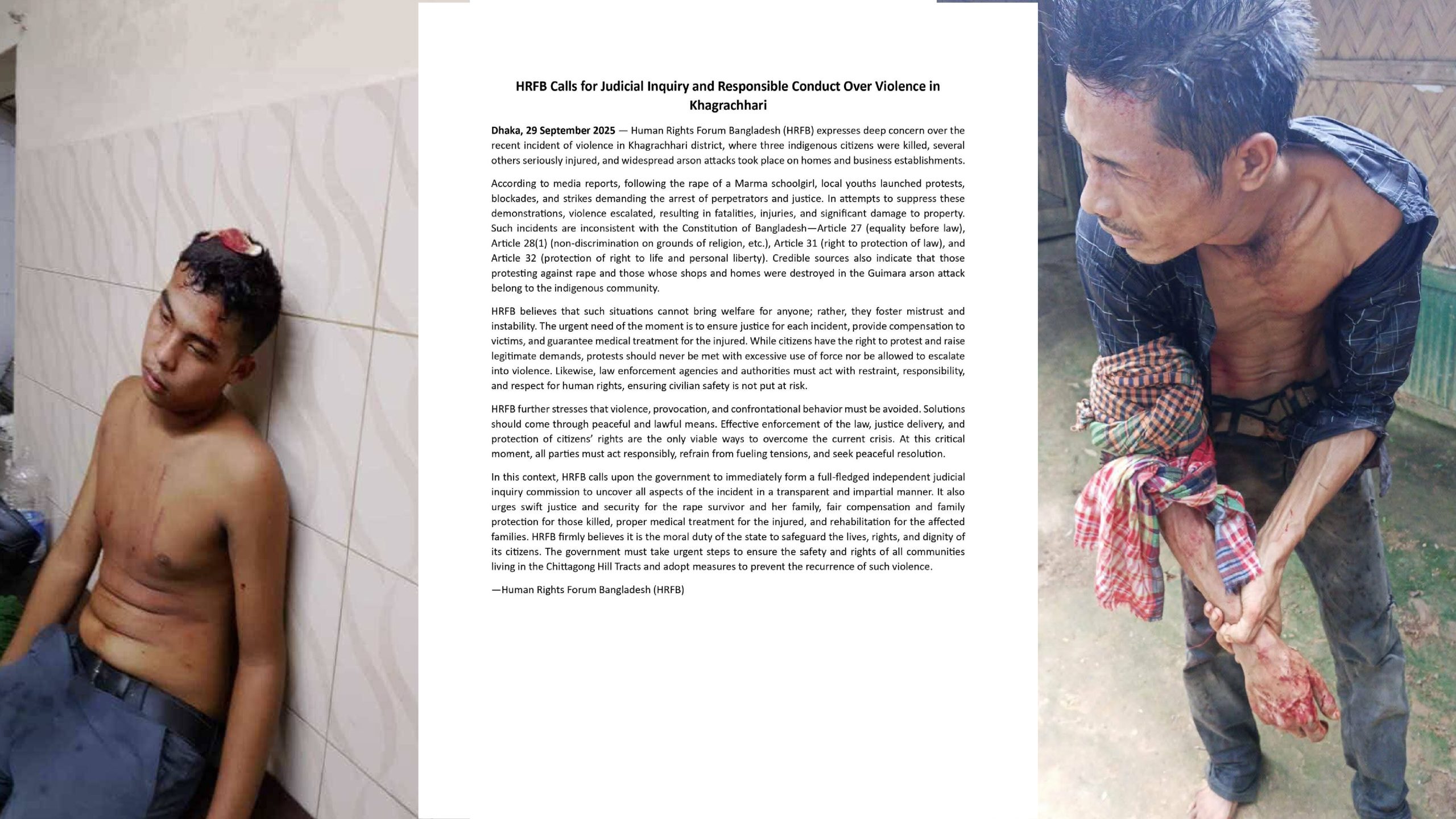 In this context, HRFB calls upon the government to immediately form a full-fledged independent judicial inquiry commission to uncover all aspects of the incidhrfbent in a transparent and impartial manner. It also urges swift justice and security for the rape survivor and her family, fair compensation and family protection for those killed, proper medical treatment for the injured, and rehabilitation for the affected families. HRFB firmly believes it is the moral duty of the state to safeguard the lives, rights, and dignity of its citizens. The government must take urgent steps to ensure the safety and rights of all communities living in the Chittagong Hill Tracts and adopt measures to prevent the recurrence of such violence.